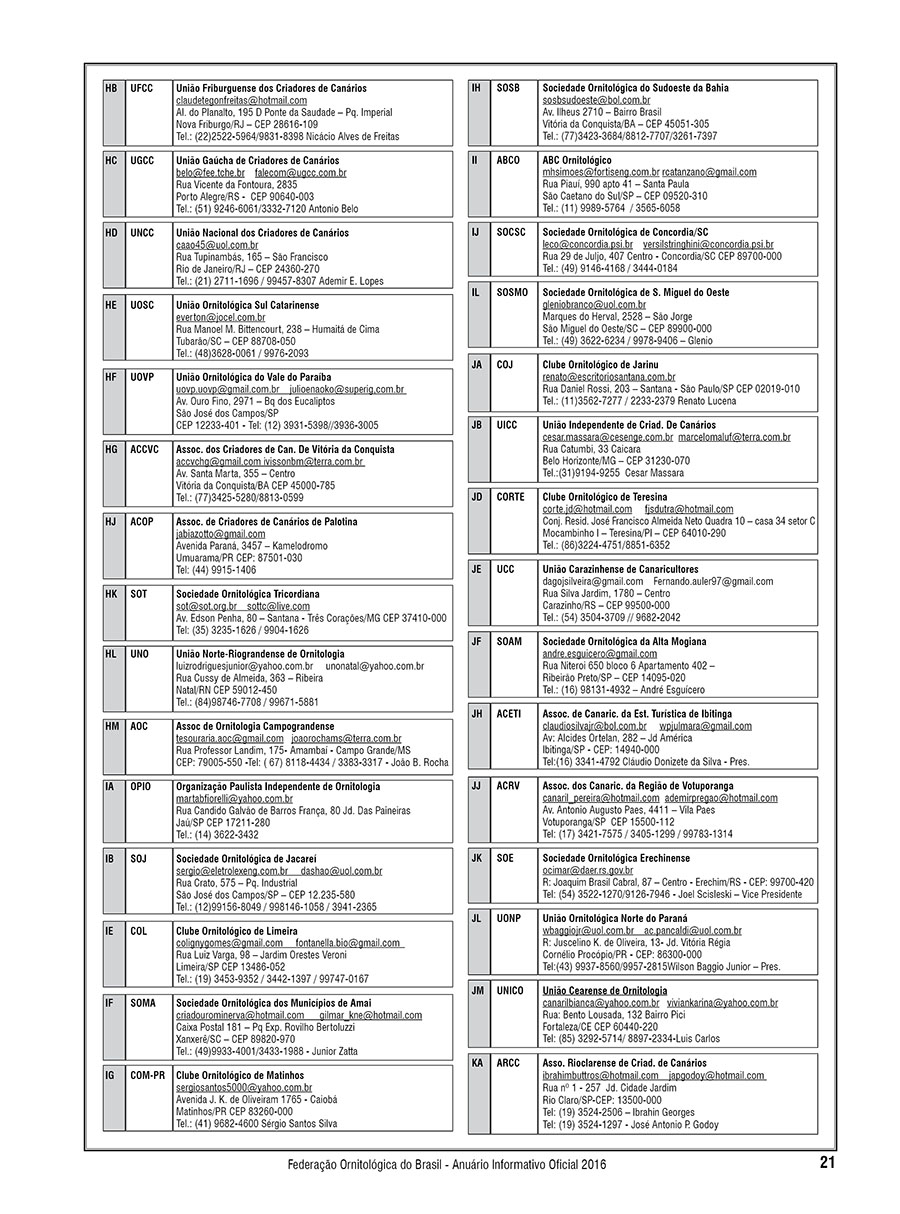 RELAÇÃO DE CLUBES DE CANARICULTORES FILIADOS A FOB 2016